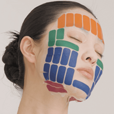 After cleansing, apply the mask to the face, keeping the text on the mask on the left side of the face and the color block outwards.
