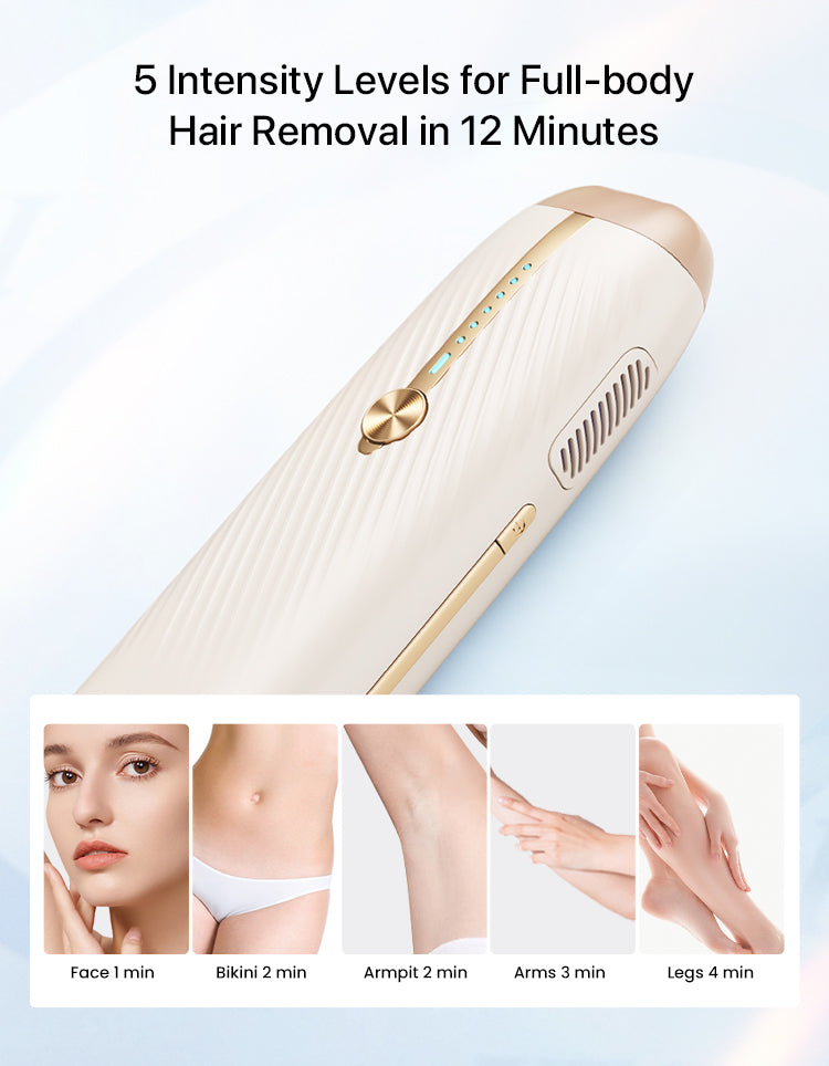 Our device offers 5 adjustable energy levels to meet the needs of different areas of your body. The ice cooling technology maintains a skin-friendly 50°F, ensuring a comfortable and safe experience. This allows the IPL pulse light to effectively target hair follicles for smooth hair removal all over your body.