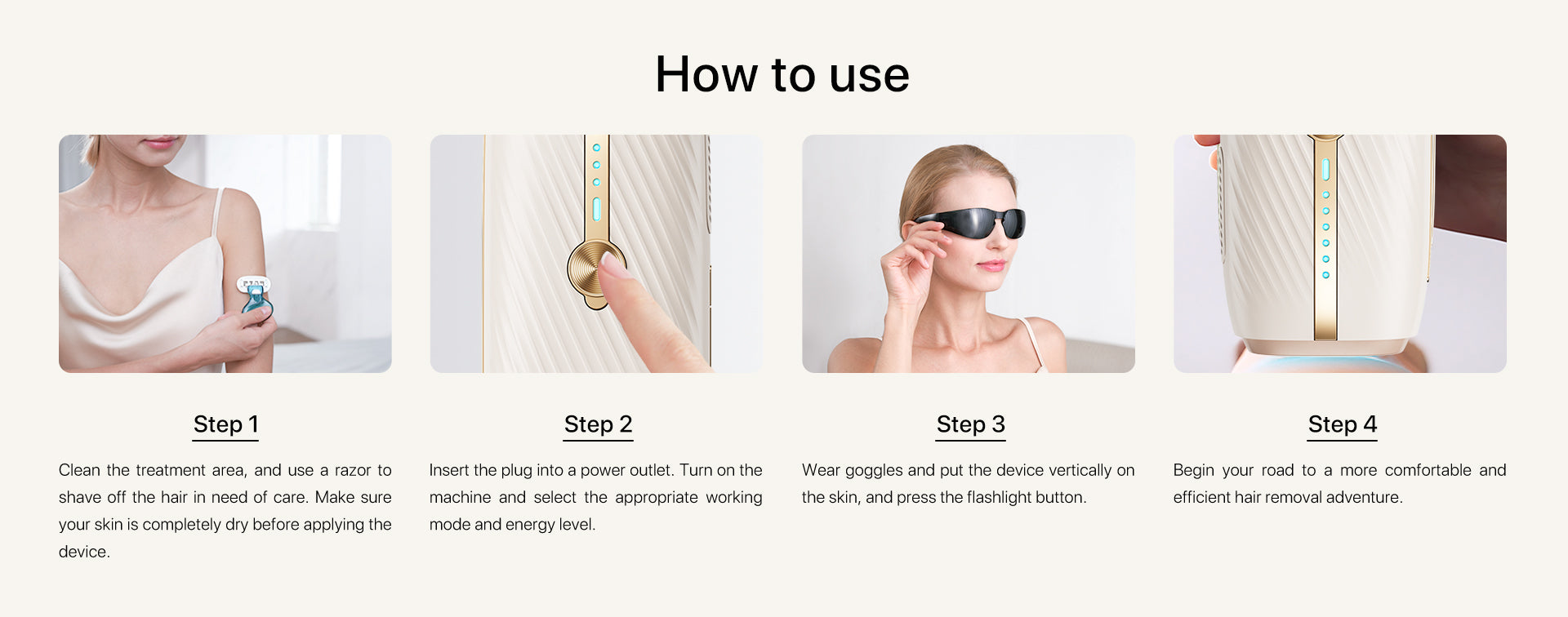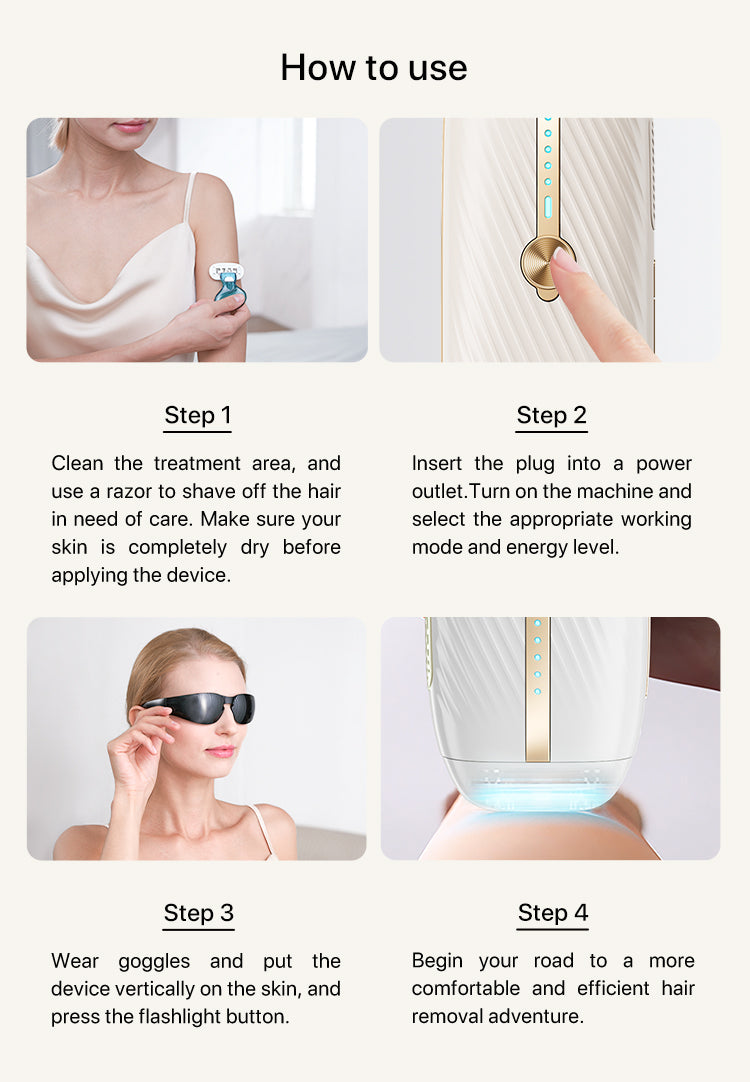 Our device offers 5 adjustable energy levels to meet the needs of different areas of your body. The ice cooling technology maintains a skin-friendly 50°F, ensuring a comfortable and safe experience. This allows the IPL pulse light to effectively target hair follicles for smooth hair removal all over your body.